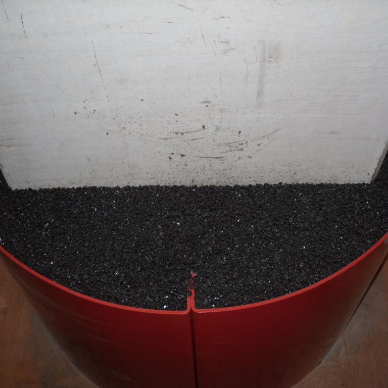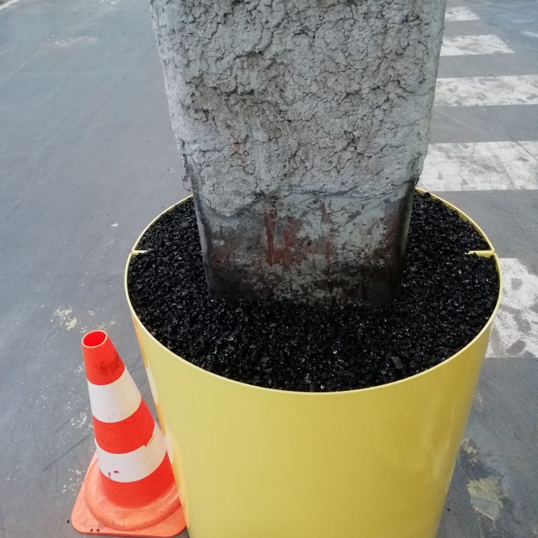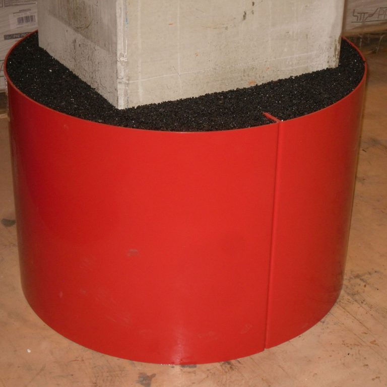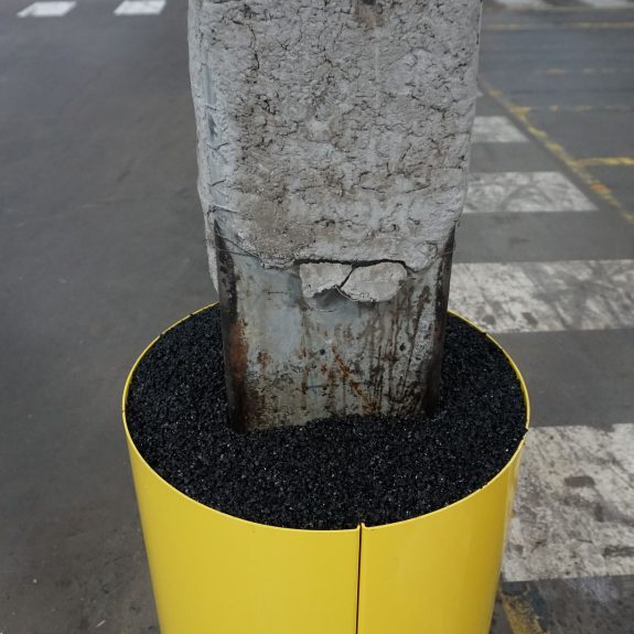 La protection de poteau = coque en acier auto-portante de 3 mm + epaisseur de caoutchouc recyclé.
