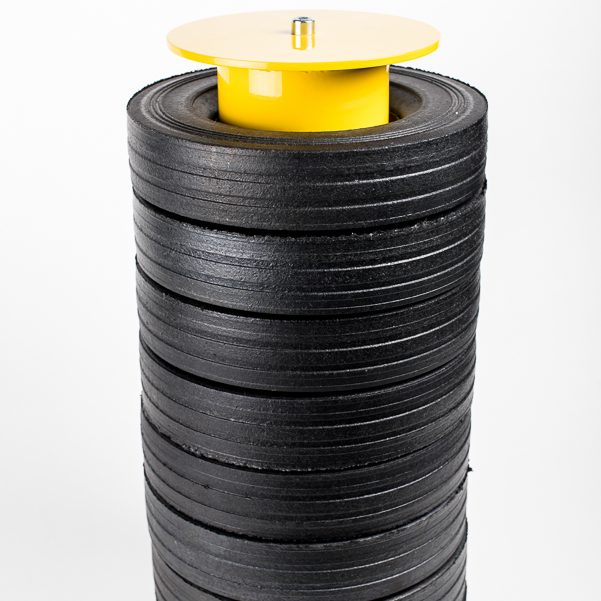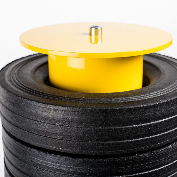 Tube d’acier recyclé + absorbeurs circulaires en pneumatique recyclé.